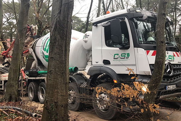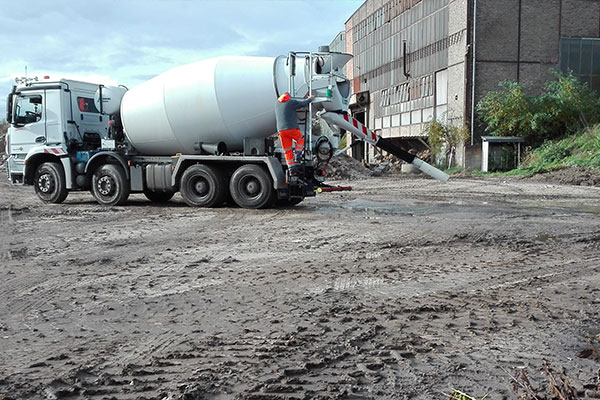 Beschreibung: Verfüllung eines alten Pumpwerkes mit bis zu 8 m Tiefe. Die Belieferung erfolgte mit bis zu 7 Mischern in Umlauf.