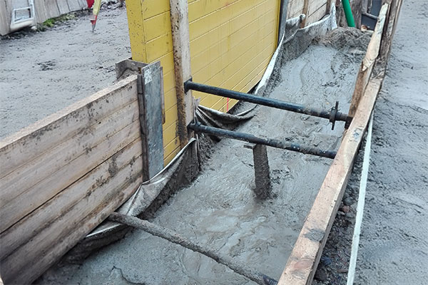 Beschreibung: Kraftschlüssige Verfüllung einer Baugrube zwischen Verbau und Baukörper. Der Arbeitsraum mit einer Breite von 15-70cm wurde durch Mastpumpen verfüllt. Trotz niedriger Temperaturen (2-5°C) erfolge die Verfestigung wie geplant