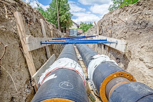 Beschreibung: Flüssigboden wurde als Rohrbettung für eine Kühlwasserleitung (DN 1200) verbaut. Der Einbau erfolgte in Teilen durch eine Mastpumpe.
